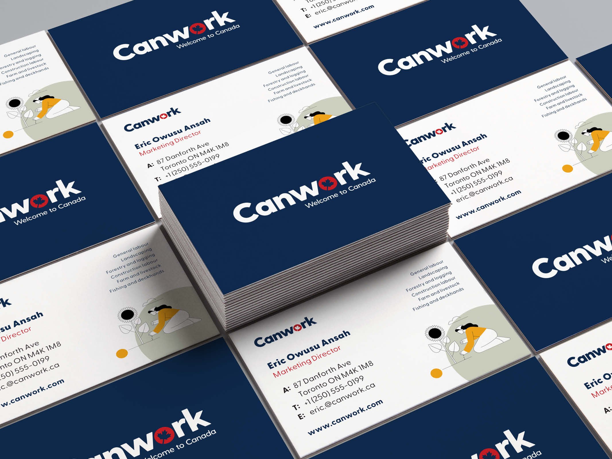 Canwork aims to create a global and inclusive community of workers and employers who can benefit from each other's skills and opportunities. We wanted to ensure the brands welcoming feeling “Welcome to Canada” was portrayed throughout the visual identity. The simple typographic logo using soft round edges combined with the maple leaf logo mark helped to unify this message.